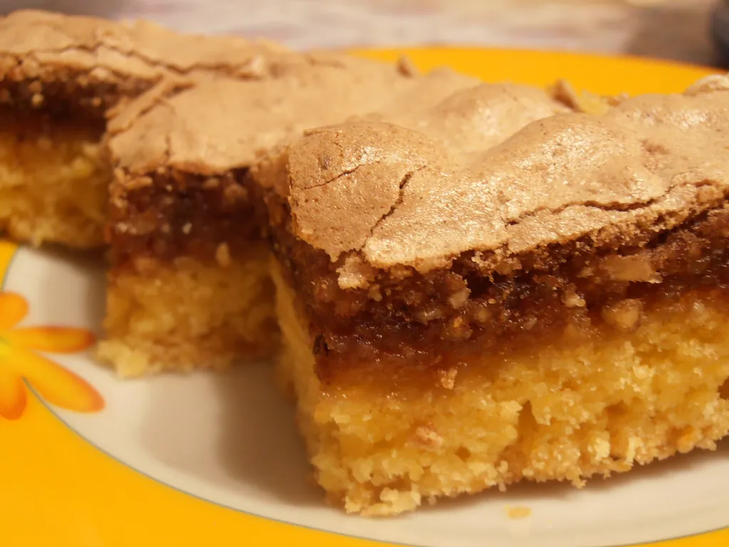 - Zapečeno tijesto premažite džemom od marelica. Na džem stavite čvrsto istučen snijeg od tri bjelanjaka i šećera, u koji ste lagano umiješali orahe.